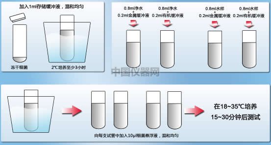 儀器使用發光細菌試劑,這種細菌在進行新陳代謝時會發出光,當這些細菌處于有重金屬和其他有機物及微生物造成的毒性環境中時,它們發出的光受到抑制,毒性越強,對發光細菌代謝的抑制作用越強,發光被抑制得越明顯,根據其光強度的變化即可快速準確地測試出樣品的毒性。