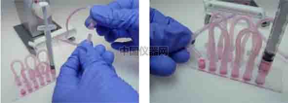 將所有的串聯管連接好后,將加滿液體排除氣泡的灌流管用封口夾夾住。